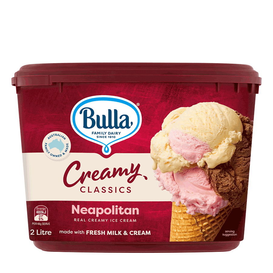 Creamy vanilla, chocolate and strawberry flavoured real ice cream. Our strawberry ice cream also features a delicious strawberry jam-style sauce. Made with fresh milk & cream.