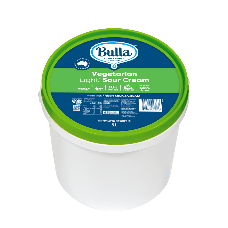 Bulla Vegetarian Light^ Sour Cream has a wonderful creamy texture and taste, and delivers these with only 18% milk fat. ^49% Less fat compared to Bulla Premium Sour Cream.